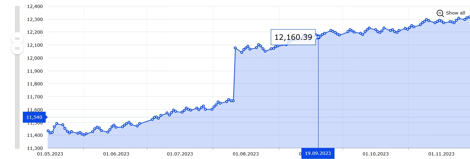 Умуман олганда, доллар курси кетма-кет иккинчи савдо куни сўмга нисбатан пасайиб, 179 сўмга ёки 12 349 сўмдан 12 171 сўмга арзонлашди. Бу – 2023 йилнинг сентябридан бери қайд этилган энг паст кўрсаткич.