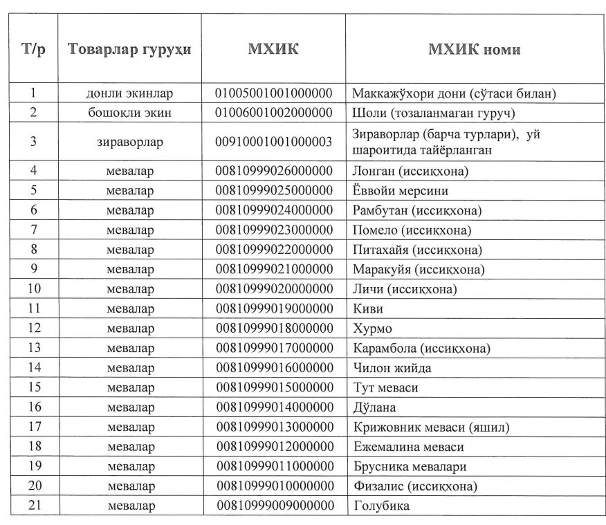 Президент фармонига мувофиқ Қишлоқ хўжалиги вазирлиги ва Солиқ қўмитаси ҚҚСнинг ноль ставкаси қўлланиладиган қишлоқ хўжалиги маҳсулотлари рўйхатини тасдиқлади.