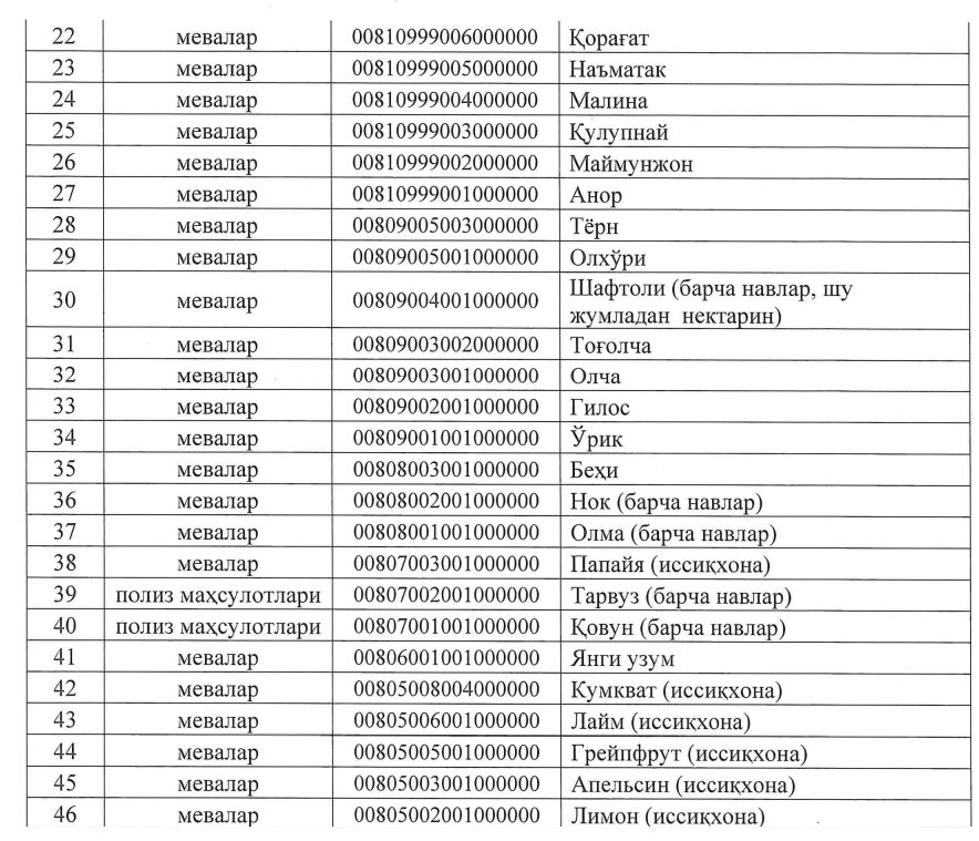 Рўйхатдан 346 та маҳсулот ўрин олган бўлиб, уларнинг тўлиқ рўйхати билан қуйидаги ҳавола орқали танишиш мумкин.