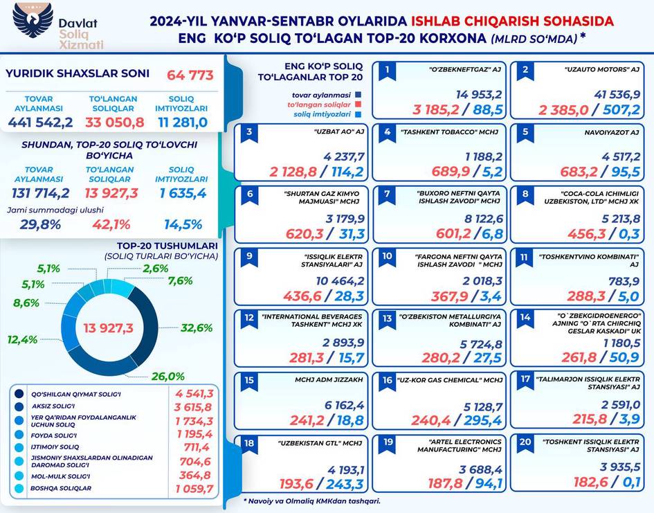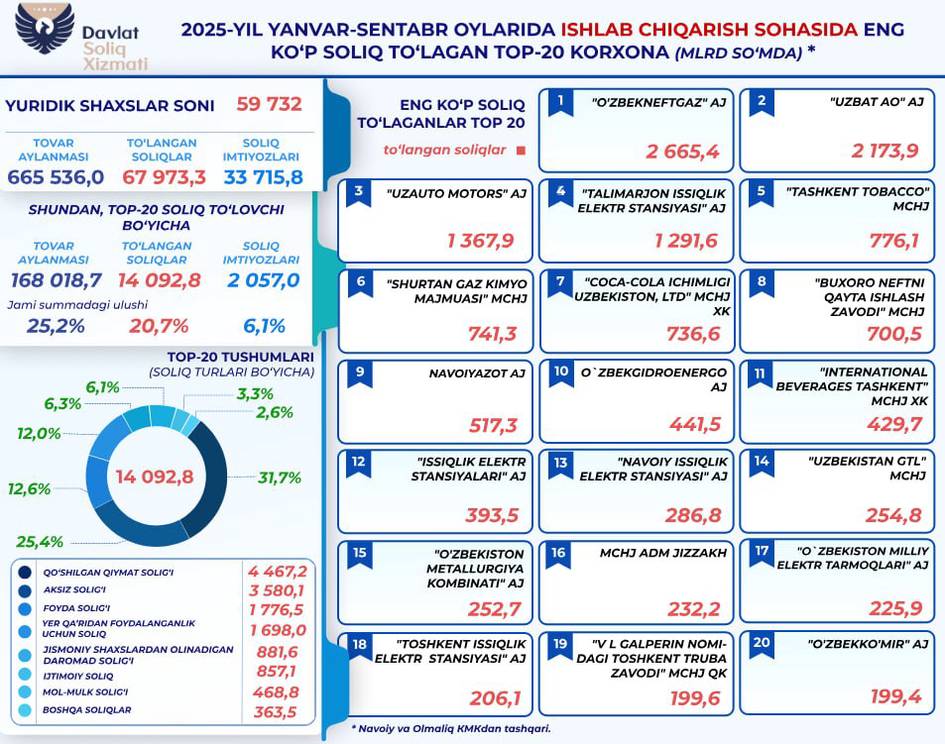 Жорий йил 9 ойида ишлаб чиқариш билан шуғулланувчи 20 та корхона солиқларнинг 14,1 трлн сўмини тўлаган. 2024 йил мос даврида улардан 13,9 трлн сўм ундирилганди.
