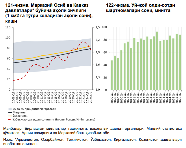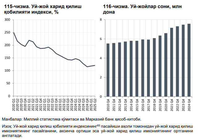 Марказий банк ҳисоботида келтирилган Миллий статистика қўмитаси маълумотларига кўра, 2025 йил I ярим йиллиги якунига кўра, уй-жойларнинг бозор нархи 2024 йилнинг мос даврига нисбатан миллий валютада 4,9 фоизга, хорижий валютада 6,2 фоизга пасайган.