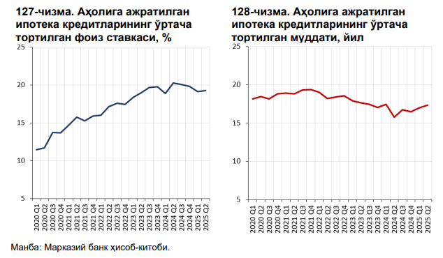 Шунингдек, 2025 йилнинг I ярим йиллигида ажратилган ипотека кредитларининг ўртача ҳажми қарийб 300 млн сўмни ташкил этган. Бу даврда аҳолига ажратилган ипотека кредитларининг ўртача тортилган фоиз ставкаси 19,2 фоизни ташкил этиб, 2024 йилнинг мос даврига нисбатан 0,4 фоиз бандга пасайган. Аҳолига ажратилган ипотека кредитларининг ўртача тортилган сўндириш муддати 0,5 йилга узайиб, 17,2 йилни ташкил этди.