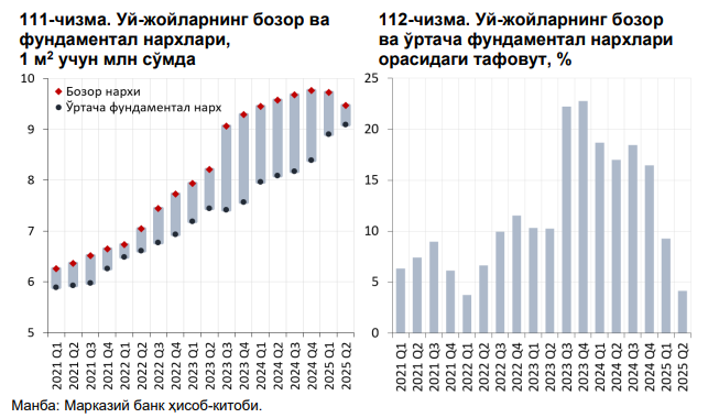 2025 йил I ярим йиллигида Ўзбекистонда уй-жойларнинг фундаментал қиймати ва бозор нархи орасидаги тафовут 17 фоиздан 4 фоизгача пасайди.