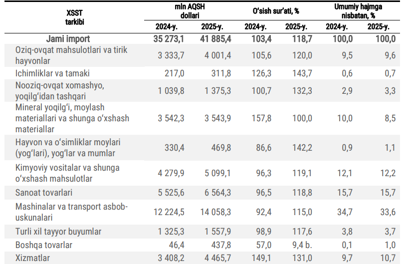 2025 йилнинг 11 ойида 4 млрд долларлик озиқ-овқат маҳсулотлари ва тирик ҳайвонлар импорт қилинган. Бу ўтган йилнинг мос даврига нисбатан 20 фоизга кўп. Энг катта ўсиш гўшт ва гўшт маҳсулотлари (761 млн долларлик) импортида кузатилган – 68,5 фоиз. Ҳисобот даврида 1 млрд 456 млн долларлик газ сотиб олинган, бу ўтган йилги кўрсаткичнинг 98 фоизини ташкил этади. Шунингдек, 1 млрд 393 млн долларлик (+5,3 фоиз) бензин импорт қилинган.