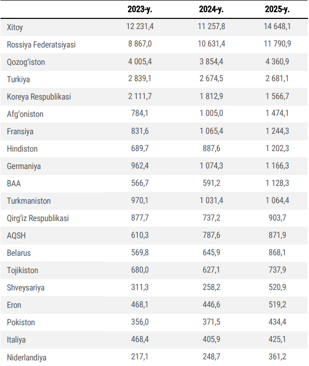 Ҳисобот даврида ташқи савдо айланмасининг салмоқли қисми Хитой (20,1 фоиз), Россия (16,2) Қозоғистон (6 фоиз), Туркия (3,7 фоиз) ва Жанубий Корея (2,2 фоиз) билан қайд этилган.