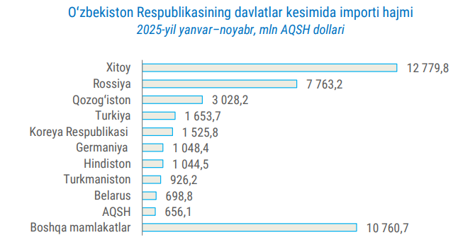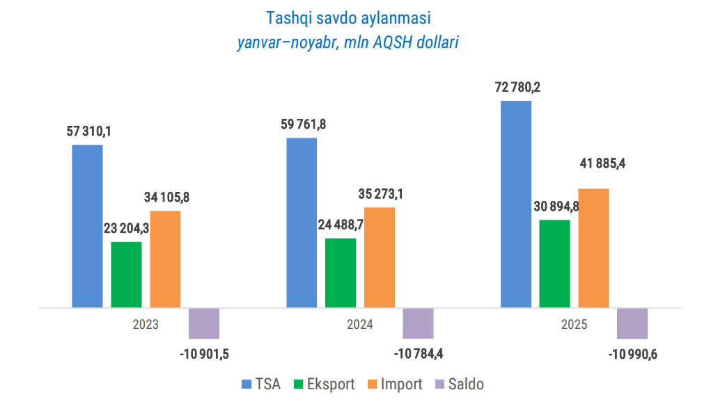 2025 йил январ-ноябр ойларида Ўзбекистоннинг ташқи савдо айланмаси 72,8 млрд долларни ташкил этди. Бу 2024 йилнинг мос даврига нисбатан 13 млрд долларга ёки 21,8 фоизга кўп.