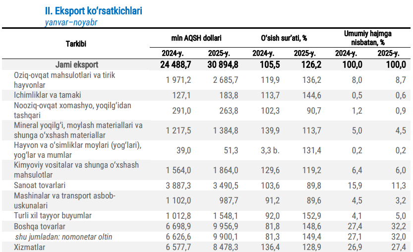 2025 йилнинг 11 ойида Ўзбекистонга 761 млн долларлик гўшт ва гўшт маҳсулотлари олиб кирилди. Бу ўтган йилнинг мос даврига нисбатан 68 фоизга кўп. Ноябр ойида ҳам олтин экспорт қилинмади.