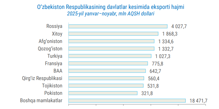 Дастлабки 11 ойликда ўтган йилнинг мос даври билан таққослаганда, йирик ҳамкор давлатлардан фақатгина Жанубий Корея (-13,5 фоиз) билан савдо айланмаси миқдори қисқарган. Қолган 19 та давлат билан умумий савдо ҳажми сезиларли даражада кўпайган. Хусусан, Швейцария (+101 фоиз), БАА (+90,8 фоиз), Афғонистон (+46,7 фоиз), Нидерландия (+45,2 фоиз) ва Ҳиндистон (+35,4 фоиз) каби давлатлар билан умумий савдо айланмасида катта ўсиш қайд этилган.